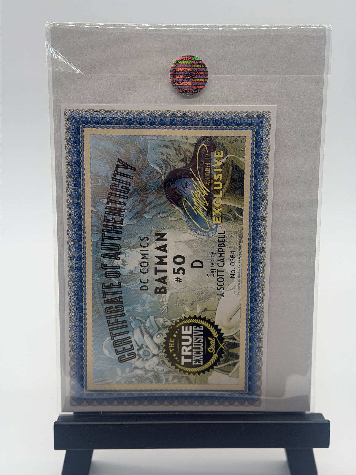 This copy is signed by J. Scott Campbell on the front cover and includes the Certificate of Authenticity shown in the listing photos. Your COA identifies the book as DC Comics Batman #50 D, signed by J. Scott Campbell, and notes it as a True Exclusive copy with COA No. 0364.